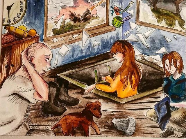 Zeichnungen und Malereien der Schülerin Milena Klots (IVK und Klasse 7d) sind seit dem ersten Advent im Glasdurchgang des Altbaus zu bestaunen. Milena, die aus der ukrainischen Stadt Charkow nahe der russischen Grenze stammt, flüchtete mit ihrer Mutter und ihrer Cousine nach Wermelskirchen und besucht seit einigen Monaten unsere Schule. Die künstlerische Begabung der Zwölfjährigen fiel schnell auf, sodass sie seit den Sommerferien am Kunstunterricht der Jahrgangsstufe 12 teilnimmt. In der Projektwoche illustrierte sie ein ukrainisches Märchen, auch dieses ist in der Ausstellung zu sehen.