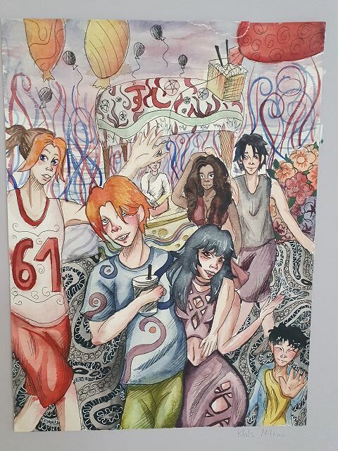 Einige Bilder wurden verkauft, so auch das Bild mit blauem Hintergrund, um den Erlös der Ukraine zu spenden. Angesichts der dargestellten Szenen kann man wohl nur erahnen, welch schreckliche Erlebnisse und Ängste einige der geflüchteten Kinder mit sich herumtragen. Dass wir trotzdem ein Umfeld bieten können, in dem sie sich – den Umständen entsprechend – gut aufgehoben fühlen, zeigen die Worte, mit denen Milena unsere Schule beschreibt: Die Kinder seien freundlich und höflich, der Unterricht interessant, die Lehrerinnen und Lehrer behandelten alle sehr gut.  An dieser Stelle sei auch ganz besonders Herrn Sohmen und seinem IVK-Team gedankt, unseren Lehrerinnen und Lehrern, die jeden Tag vor neuen Herausforderungen stehen und wertvolle Arbeit für die Kinder und unsere Schule leisten!