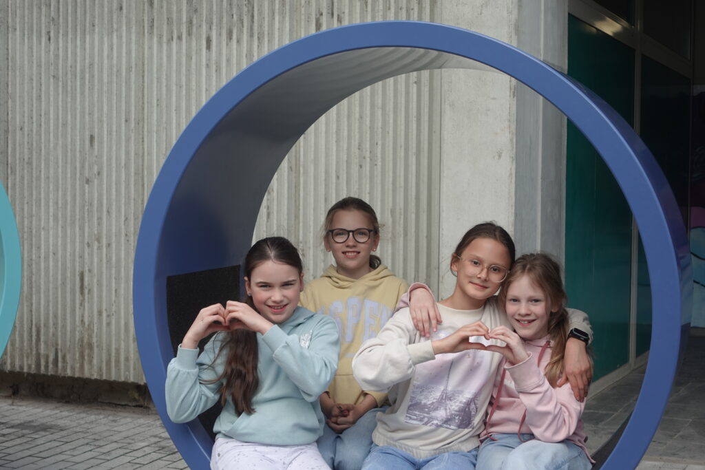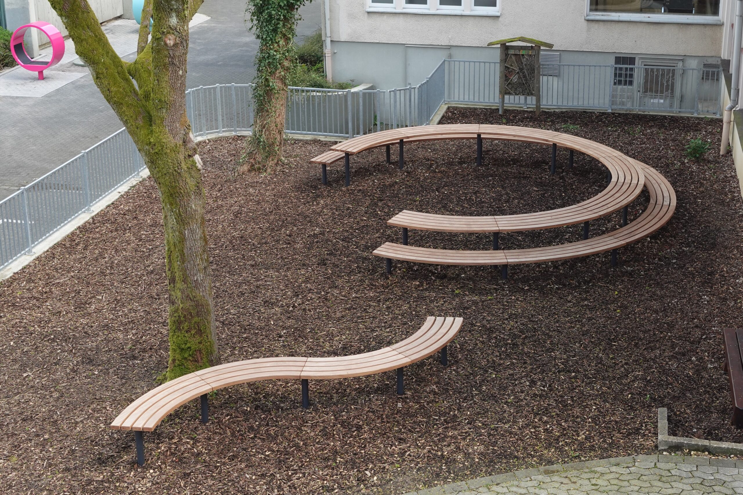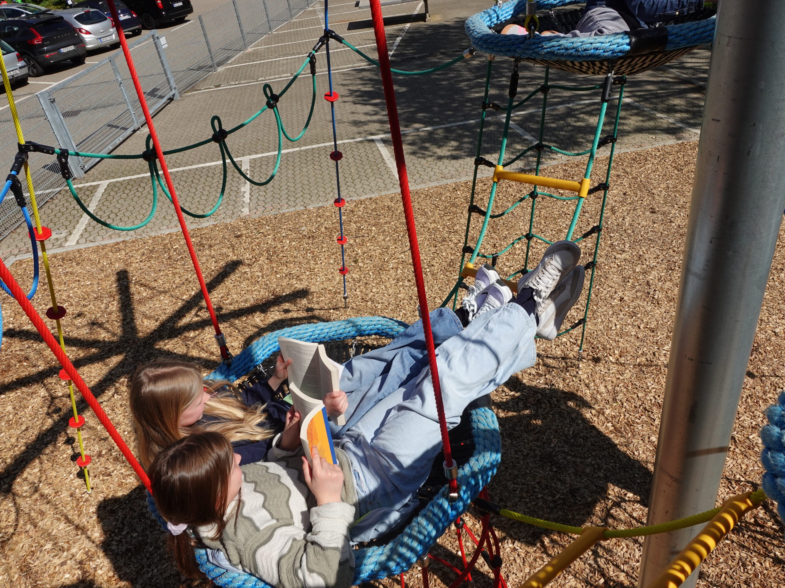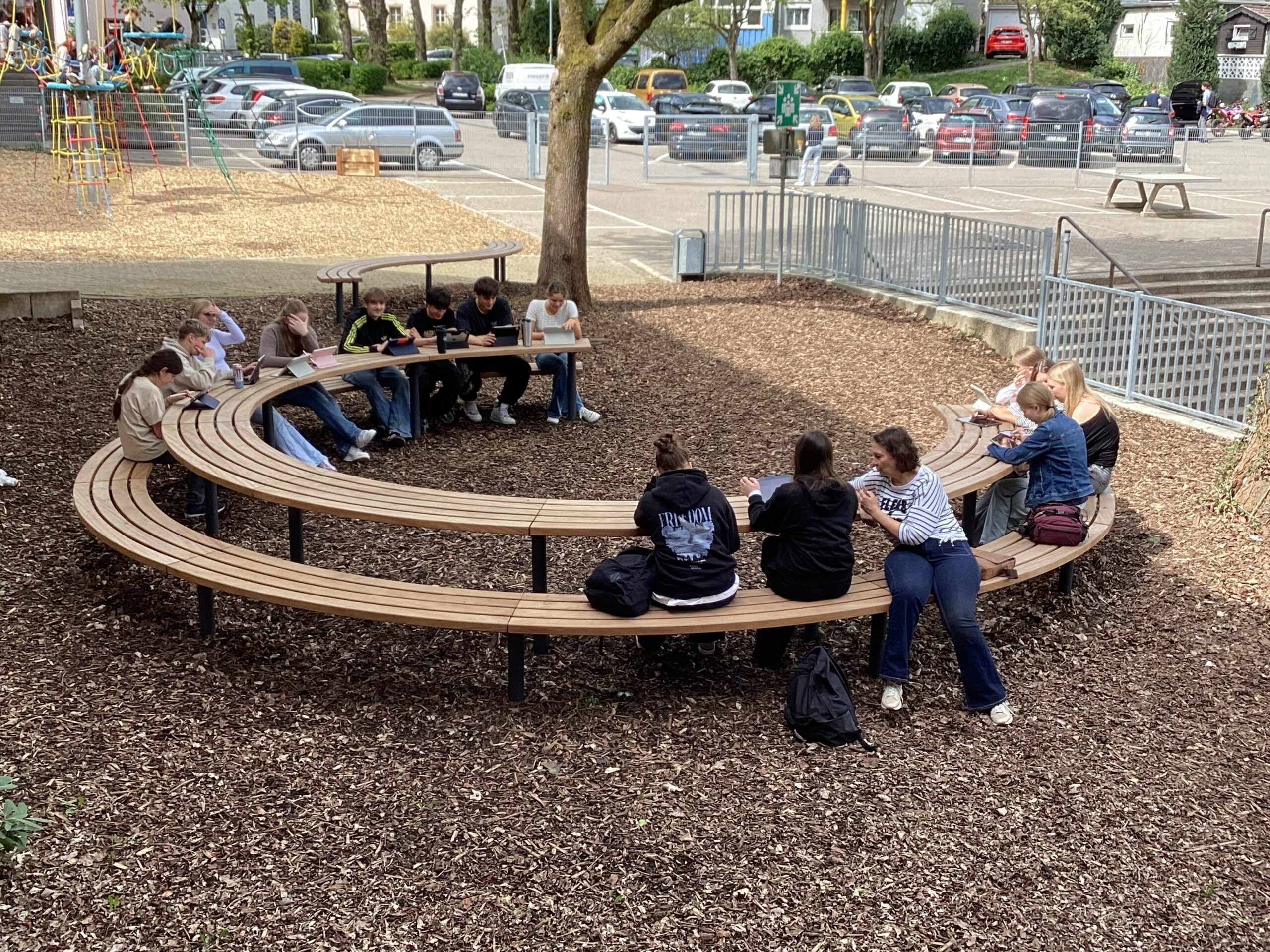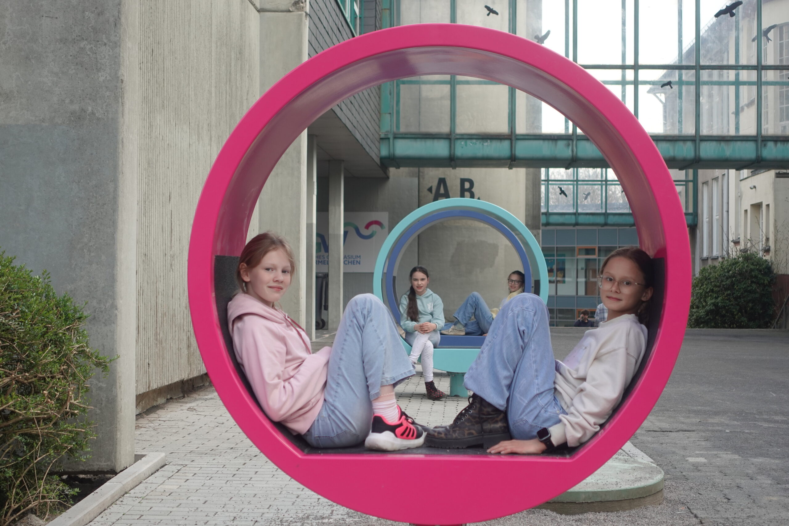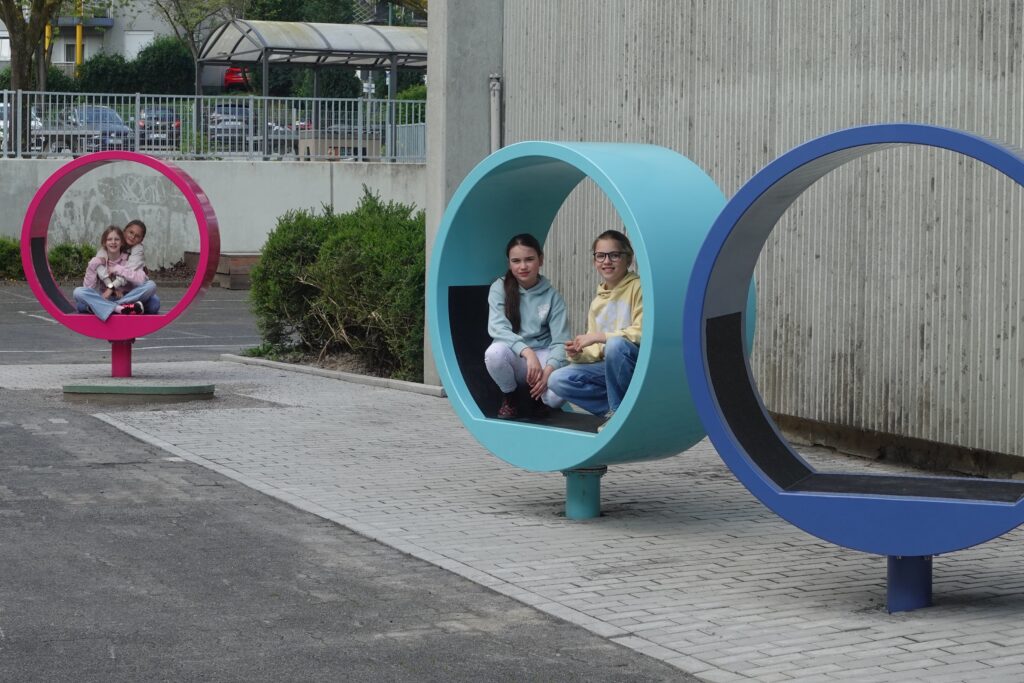 Nach den Osterferien war dann auch das Geheimnis um die Baustelle vor dem Eingang gelüftet. Drei drehbare Sitzringe in den Farben des Schullogos präsentierten sich der Schulgemeinde und wurden sofort in Beschlag genommen. Seitdem gibt es kaum einen Moment, in dem sie nicht genutzt werden – um darauf herumzuklettern, liegend ein Buch zu lesen oder einfach nur sitzend die Frühlingssonne zu genießen.