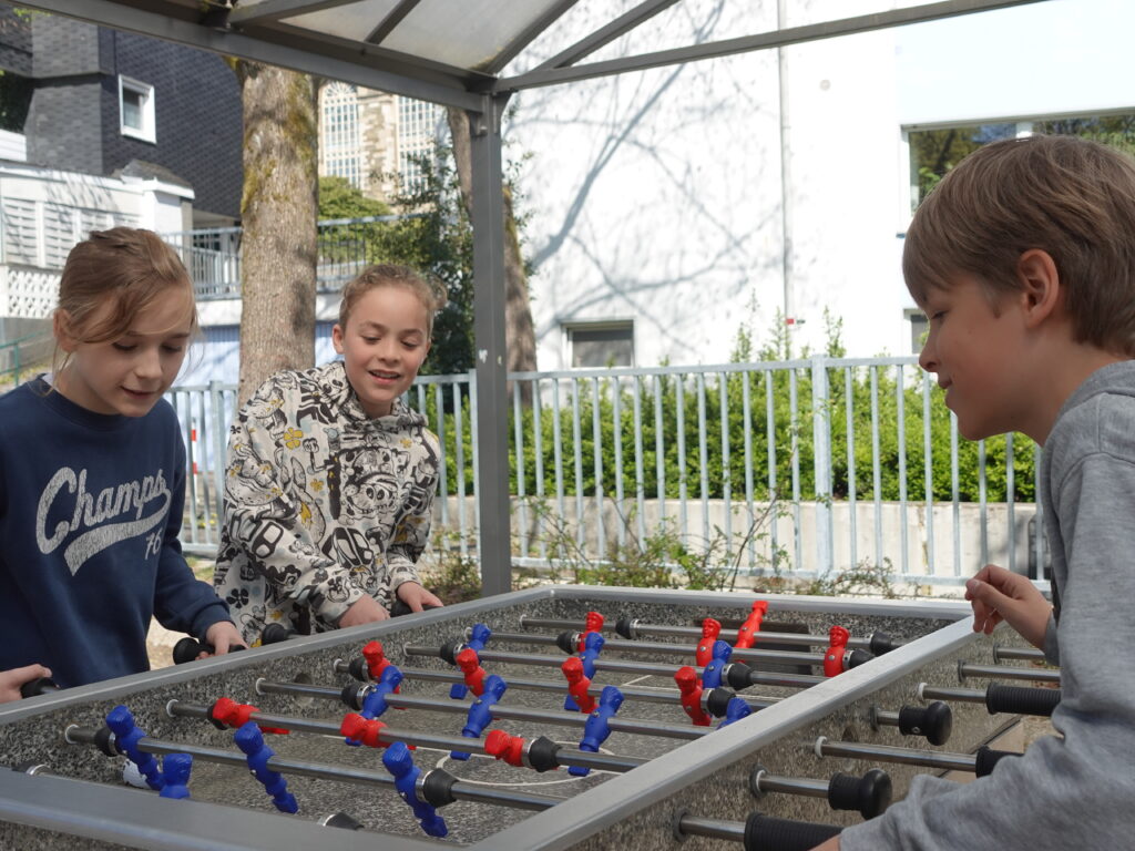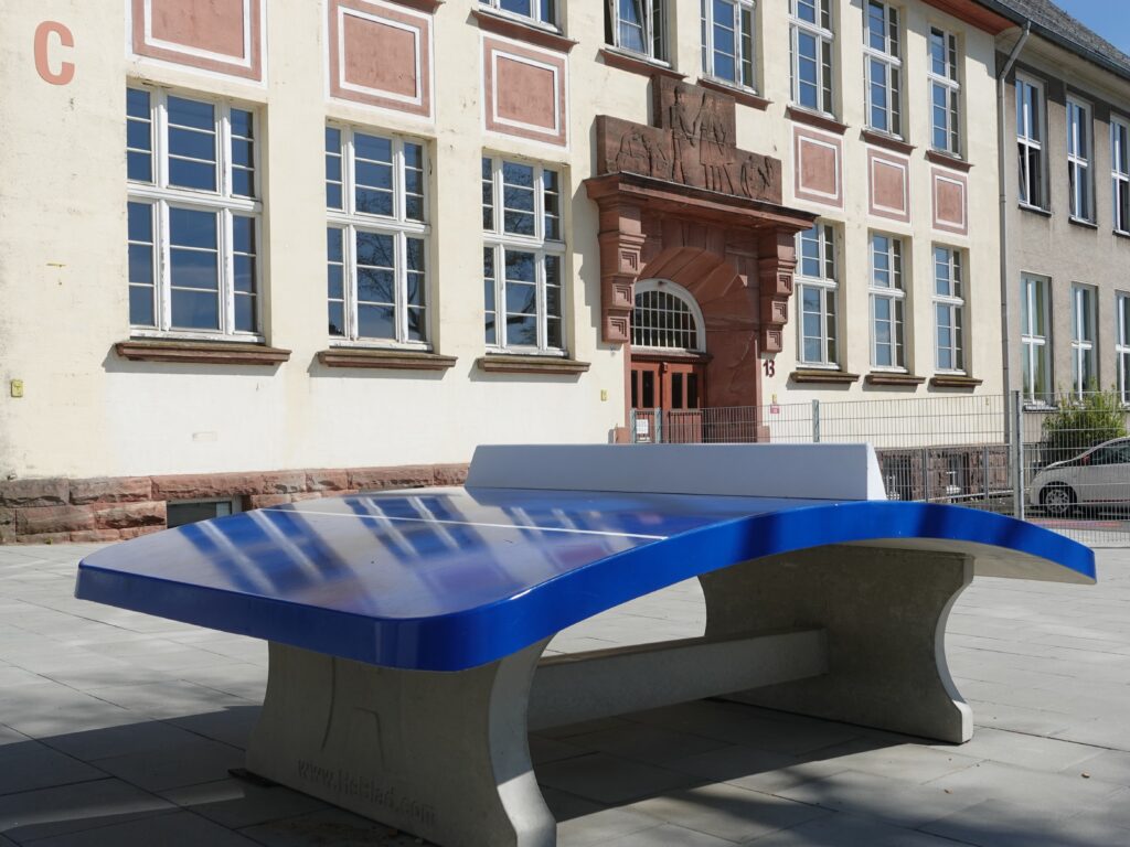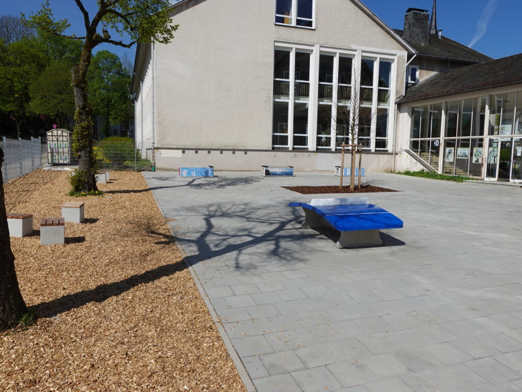 Auch in Richtung Heinrich-Heine-Platz hat sich viel getan. Ein neues Klettergerüst erweitert dort das Bewegungsangebot. Ergänzt wird es durch Tischtennisplatten, die vom ehemaligen Nebengebäude übernommen und hier neu installiert wurden, sowie durch einen neuen Outdoor-Kicker. Zudem laden wellenförmige Bank- und Tischkombinationen zum Verweilen ein, und ein Podest kann wahlweise als Bühne oder Sonnendeck für entspannte Pausenmomente genutzt werden.