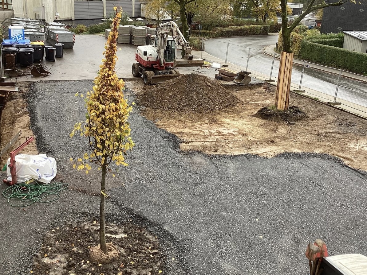 Den Anfang machte die Erweiterung des Schulhofs. Ein Teil des Lehrerparkplatzes vor dem Altgebäude sowie ein Abschnitt des Heinrich-Heine-Platzes wurden dem Schulgelände zugeschlagen und mit einer Zaunanlage eingefasst. Diese war als erstes fertiggestellt – für unsere Schüler:innen aber verständlicherweise keine große Attraktion.