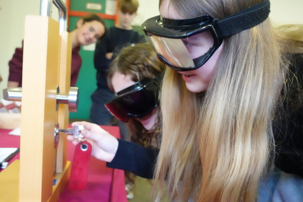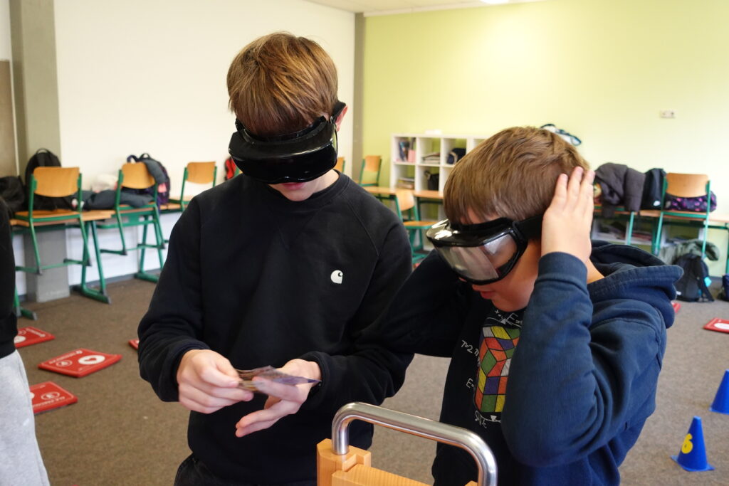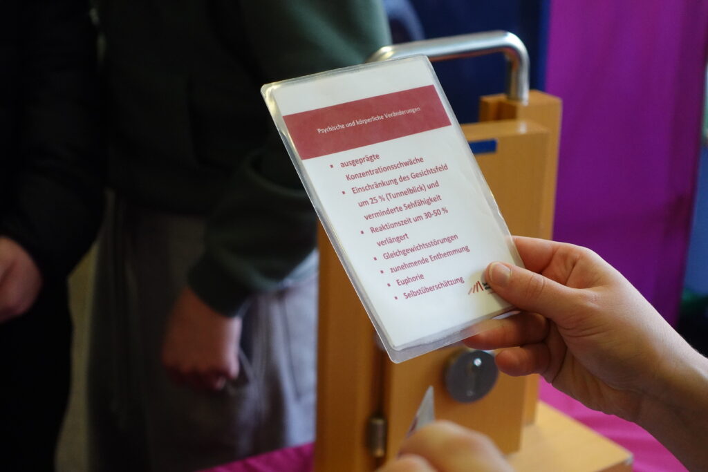 Ein Highlight war der Mitmach‑Parcours mit einer Simulationsbrille, die den Zustand unter Alkoholeinfluss nachempfindbar machte. Dabei sollten die Teilnehmenden unter erschwerten Bedingungen einen Slalom bewältigen, Geldscheine heraussuchen und bezahlen sowie mit einem Schlüssel eine Tür aufschließen. Die Übung zeigte eindrücklich: Alkohol beeinträchtigt die Koordination und macht selbst einfache Aufgaben zu echten Herausforderungen.