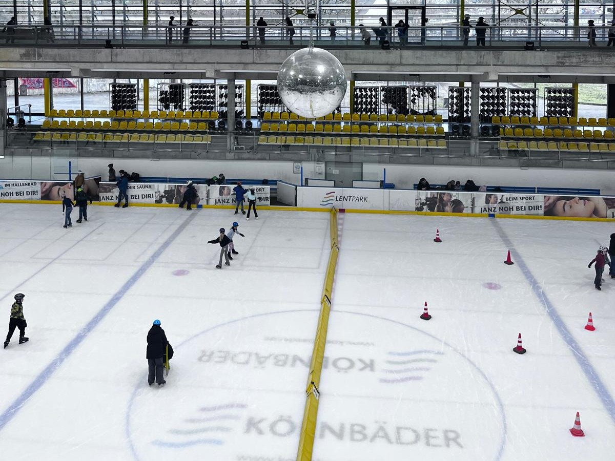 Vor Ort liehen wir Schlittschuhe aus – und dann ging es auch schon aufs Eis. Drei Stunden lang konnten unsere Schülerinnen und Schüler ihre Runden drehen, neue Tricks ausprobieren oder einfach gemeinsam Spaß haben. Wer noch unsicher auf den Kufen war, erhielt Unterstützung von erfahrenen Mitschülerinnen und Mitschülern. So wurde gegenseitige Hilfe ganz selbstverständlich gelebt.